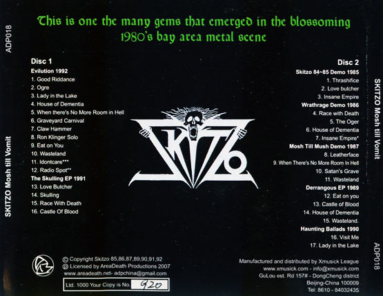 На первом диске представлены дебютный полнометражник Evilution 1992 года и епишка The Skulling 1991 года. На втором диске три демки, Derangeous EP 1989 года и сингл Haunting Ballads. Очень неплохой подгон от AreaDeath Productions.