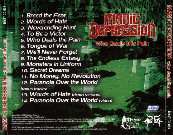 Весной 2003 года группа садится за запись, причем к моменту записи в альбоме слегка меняется трэк-лист. Запись курирует Видади Мирзоев, известный по работе с демо-версией, а также запись барабанов курирует Дмитрий Борисенков, поскольку драм-сессия пишется на студии Черный Обелиск. Все остальные партии группа записывает на собственной студии PowerSkya Studios. К середине лета работа над альбомом закончена финальным мастерингом на VMH Studio и коллектив подписывает контракт с Metalagen/Союз. 26 октября Manic Depression проводит концерт-презентацию своего дебютного СD "Who Deals The Pain", замечательно встреченного критикой и публикой.
